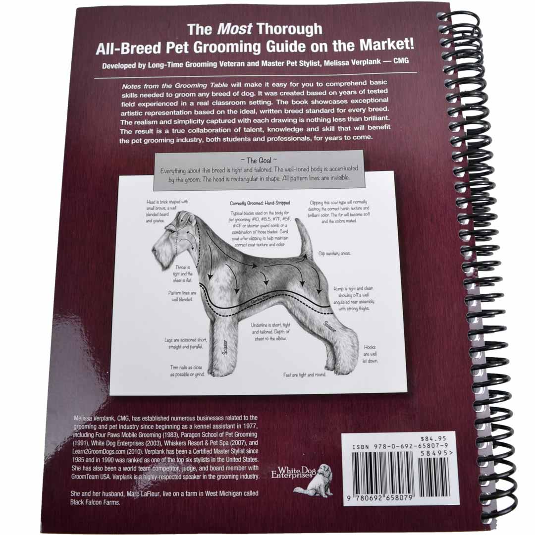 Referenčni priročnik z vsemi pasmami za profesionalne frizerje in negovalce psov. V drugi izdaji priročnika najdete polno ilustracij ter navodila za nego korak za korakom. Priročnik Notes from the grooming table je napisala znana pasja frizerka, predavateljica in sodnica Melissa Verplank (CMG) in temelji na njenih dolgoletnih izkušnjah. Priročnik je v angleškem jeziku. Skice v priročniku prikazujejo osnovne linije striženja, ki so prikazane tako, da za njihovo razumevanje ne potrebujete znanja angleškega jezika. Posebna pozornost pri oblikovanju videza psa je namenjena AKC standardom. Kljub temu v knjigi najdete tudi preproste napotke in skice za alternativno nego in striženje psov po željah lastnikov.