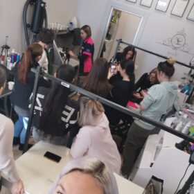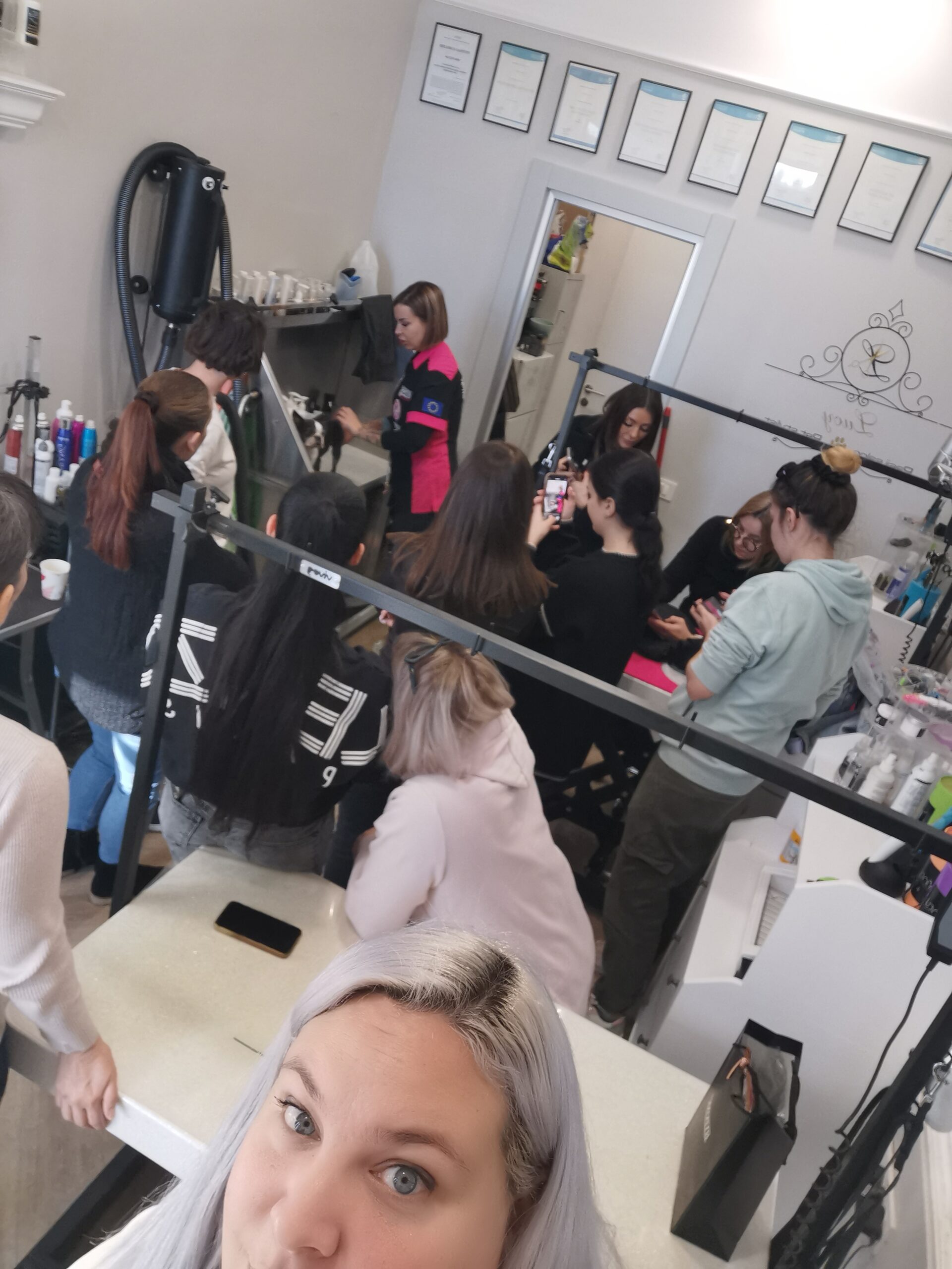 Obnovile in utrdile smo znanje trimanja, preizkusile smo se v eni izmed tehnik delanja barvnih podaljškov v dlaki ter izvedle keratinsko terapijo na dolgodlakem psu.